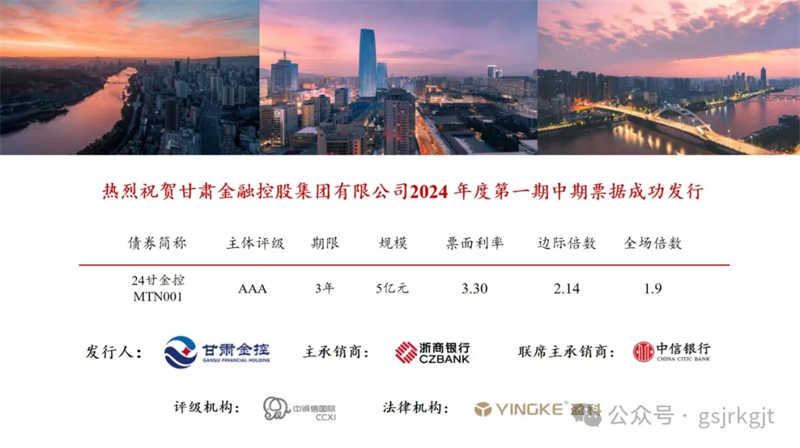 2024年3月28日,甘肅金融控股集團有限公司成功發(fā)行2024年度第一期中期票據(jù),發(fā)行規(guī)模5億元,債券期限三年,票面利率3.3%,債券票面利率創(chuàng)集團近三年同品種債券利率新低。
