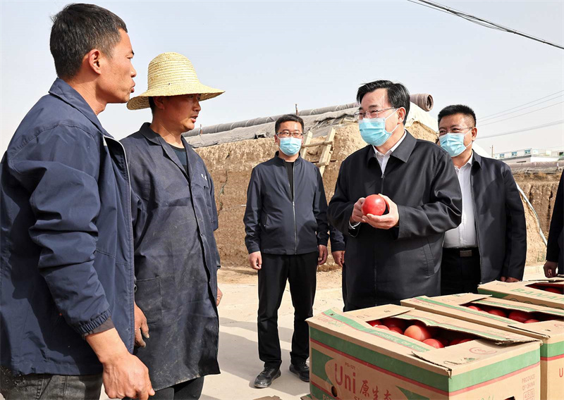 在白銀區武川鄉紅峴村、靖遠縣東灣現代農業產業園,胡昌升走進田間地頭、蔬菜大棚,與正在勞作的群眾親切交流,詳細詢問春耕生產、鄉村振興等情況。他強調,要做好農資農機服務保障,加強農業技術指導,全力抓好春耕生產。要善于挖掘和利用本地優勢資源發展特色富民產業,培育壯大新型農業經營主體,提升組織化集約化水平,促進農業增產增效、農民增收致富。要落實五級書記抓鄉村振興要求,發揮好基層黨組織和黨員干部作用,更好組織群眾、宣傳群眾、凝聚群眾、服務群眾,緊緊圍繞促進農民增收這個中心任務,把黨組織建在產業鏈上,把黨員聚在產業鏈上,讓群眾富在產業鏈上,把黨的組織優勢轉化為加快鄉村發展的實際成效。