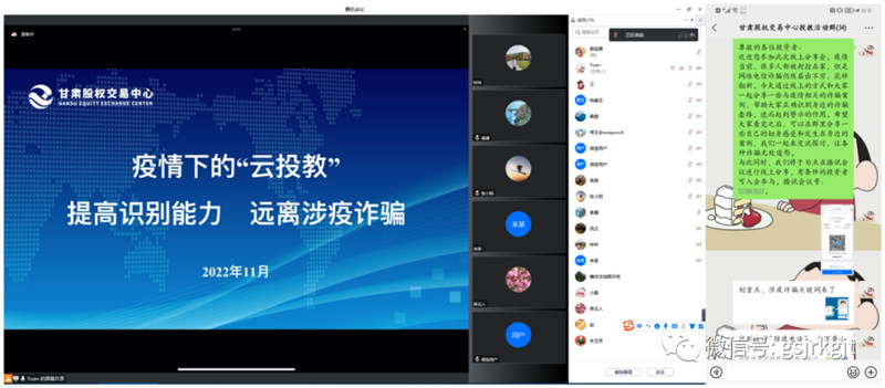 網(wǎng)絡時代給我們的生活帶來了極大的便利,但多數(shù)大齡投資者接受與使用網(wǎng)絡工具的程度較低,風險識別能力不足,甘肅股權(quán)交易中心按照合格投資者年齡結(jié)構(gòu)及使用偏好通過微信、騰訊會議等線上交流方式,組織投資者觀看涉疫詐騙視頻及案例。