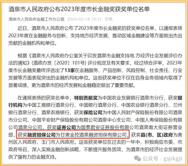 近日,酒泉市人民政府公布了2023年度市長金融獎的獲獎單位名單,通報表揚2023年度在金融服務(wù)與創(chuàng)新、支持地方經(jīng)濟發(fā)展、推動區(qū)域金融建設(shè)等方面做出杰出貢獻的金融機構(gòu)和單位,甘肅金控酒泉融資擔保有限公司榮獲酒泉市“2023年度市長金融獎”。