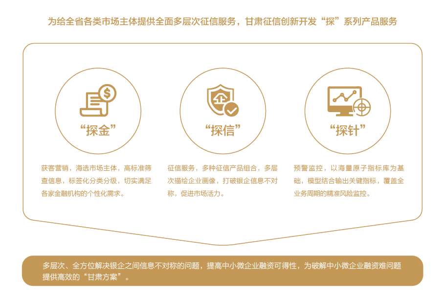 甘肅征信建立以征信數(shù)據(jù)庫、數(shù)據(jù)處理系統(tǒng)、征信智能應(yīng)用系統(tǒng)為核心的企業(yè)征信服務(wù)平臺,為客戶提供征信報告、信息核驗、信用評分、智能風(fēng)控分析決策等綜合信用服務(wù),實現(xiàn)在線經(jīng)濟金融、社會管理、公共服務(wù)等多領(lǐng)域的廣泛應(yīng)用。
